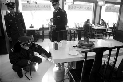 执法人员在涮肉馆检查燃气罐。本报记者欧阳晓菲摄